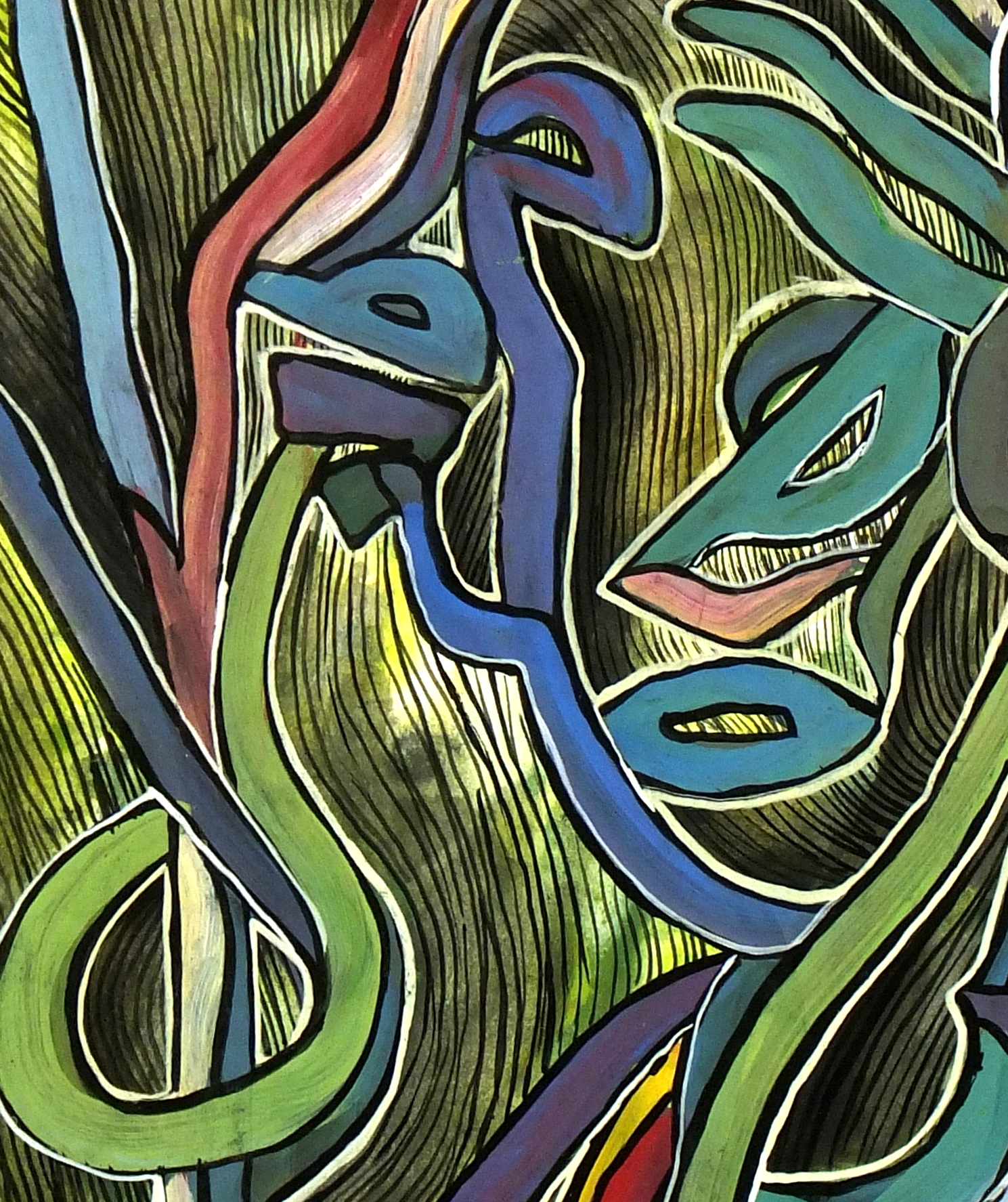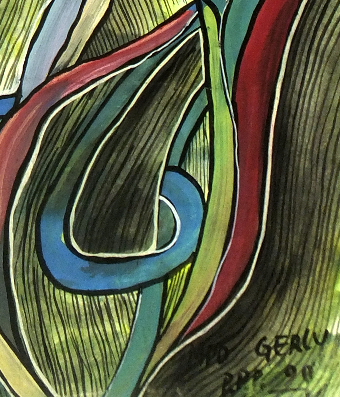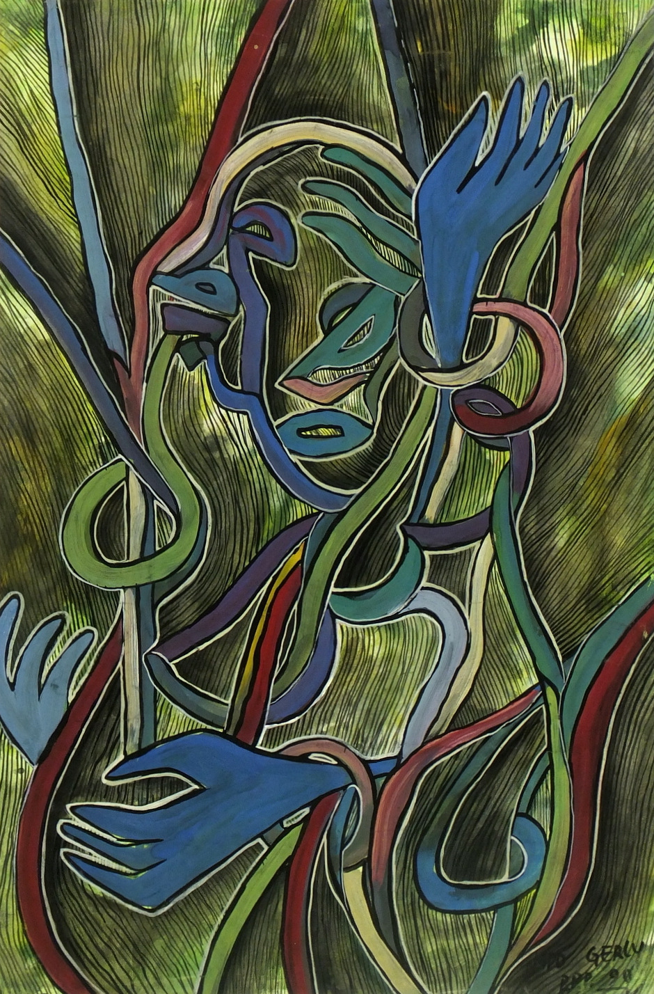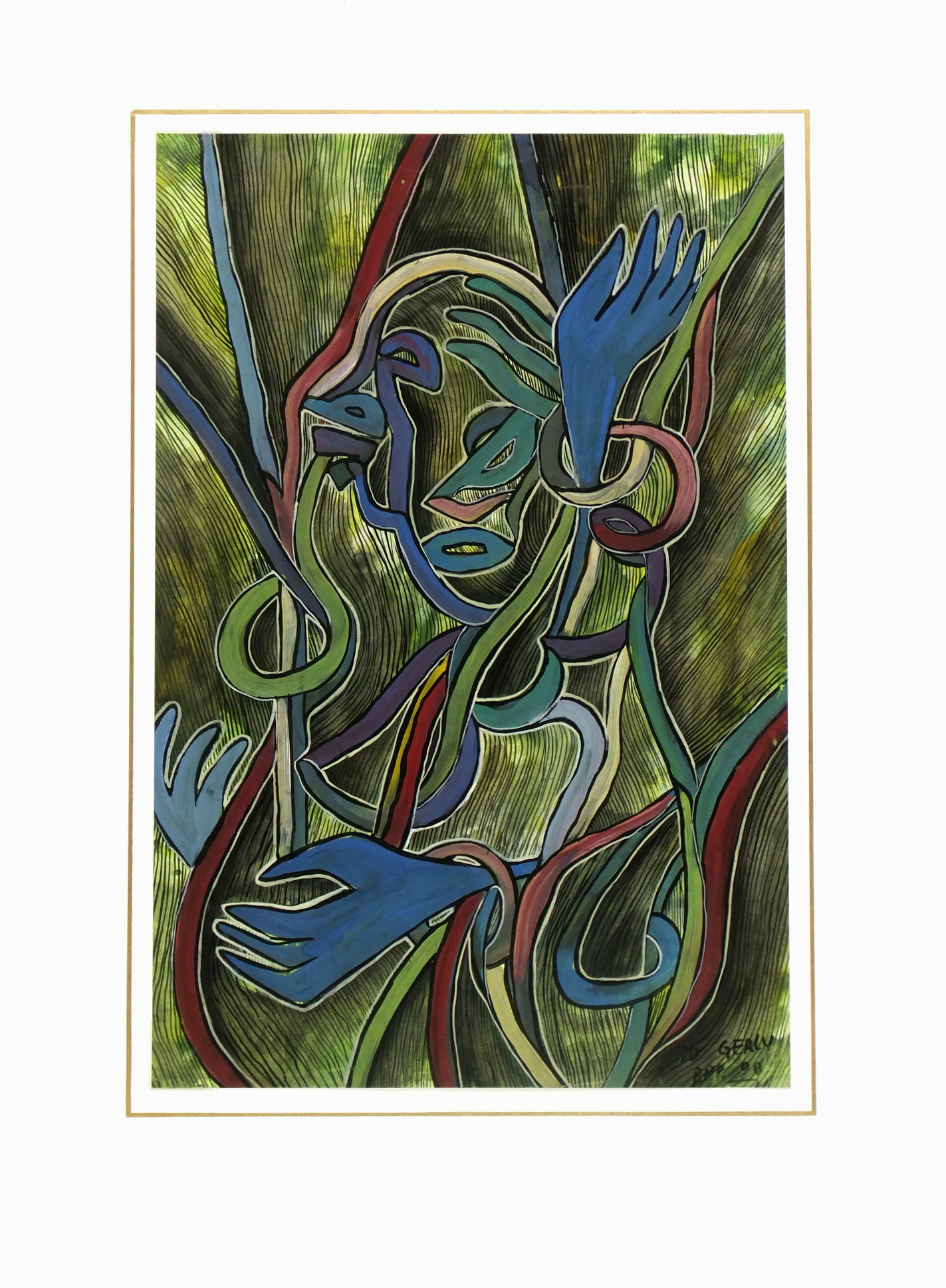 Mesmerizing ink and gouache abstract painting of intertwining hands by artist Gerly, 1990. Signed and dated lower right.