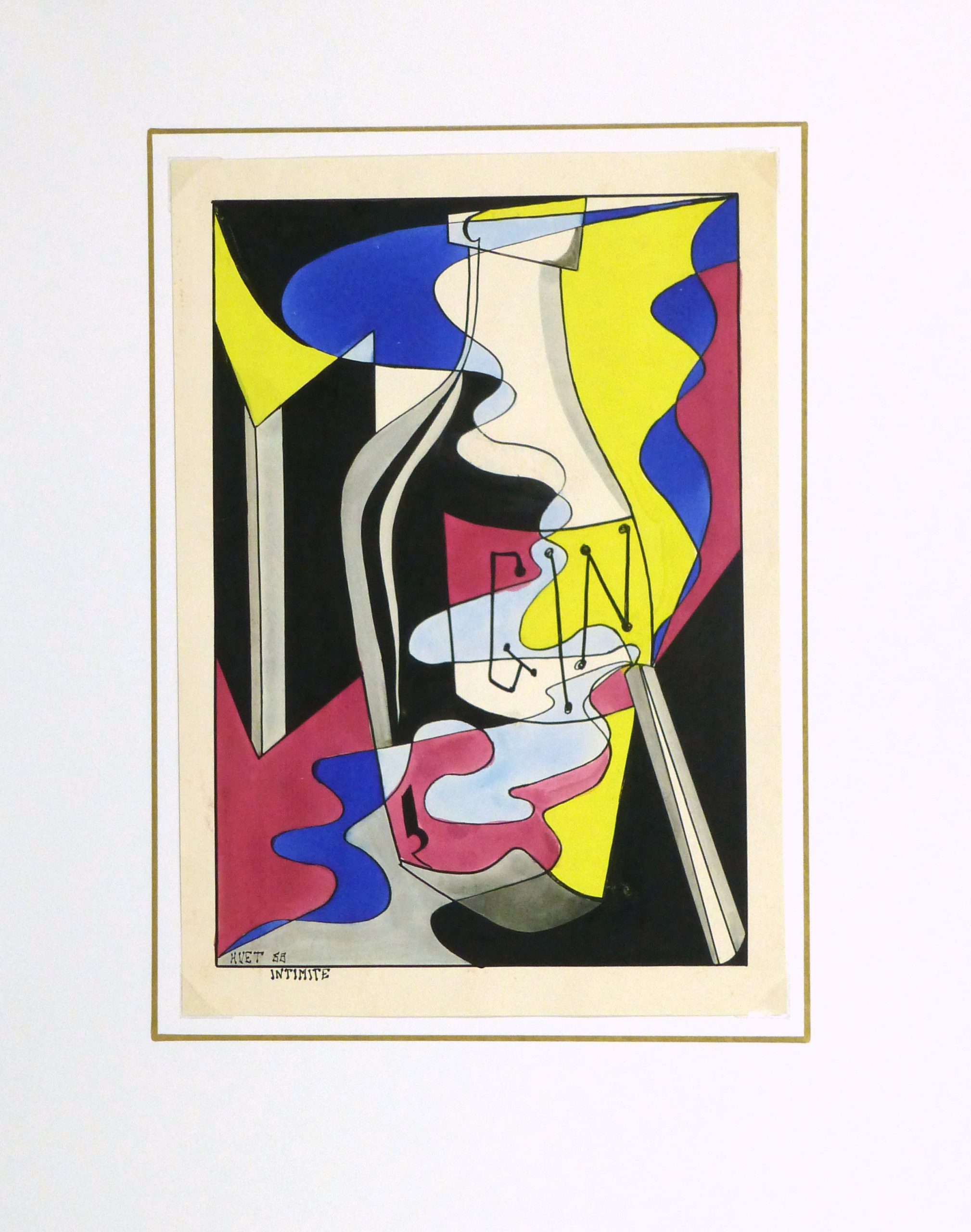 Original one-of-a-kind artwork on paper displayed on a white mat with a gold border. Mat fits a standard-size frame. Archival plastic sleeve and Certificate of Authenticity included. Artwork, 9.25″L x 13″H; mat, 16″L x 20″H.