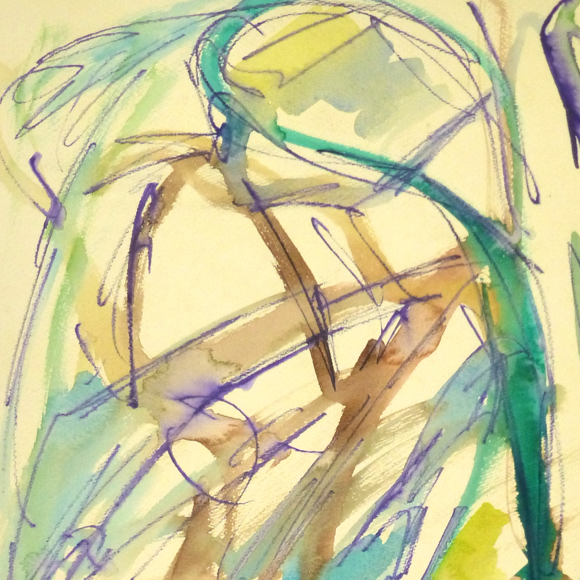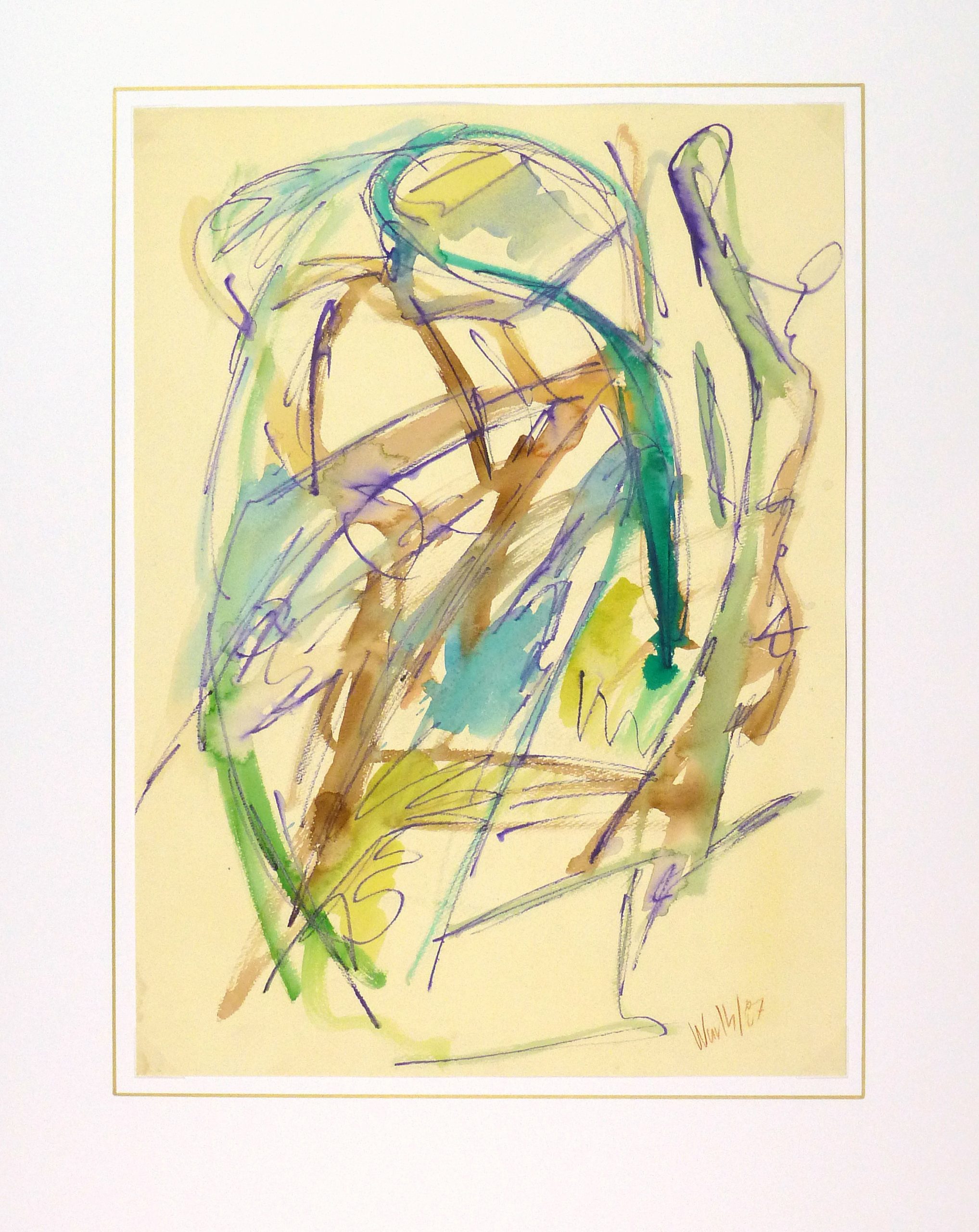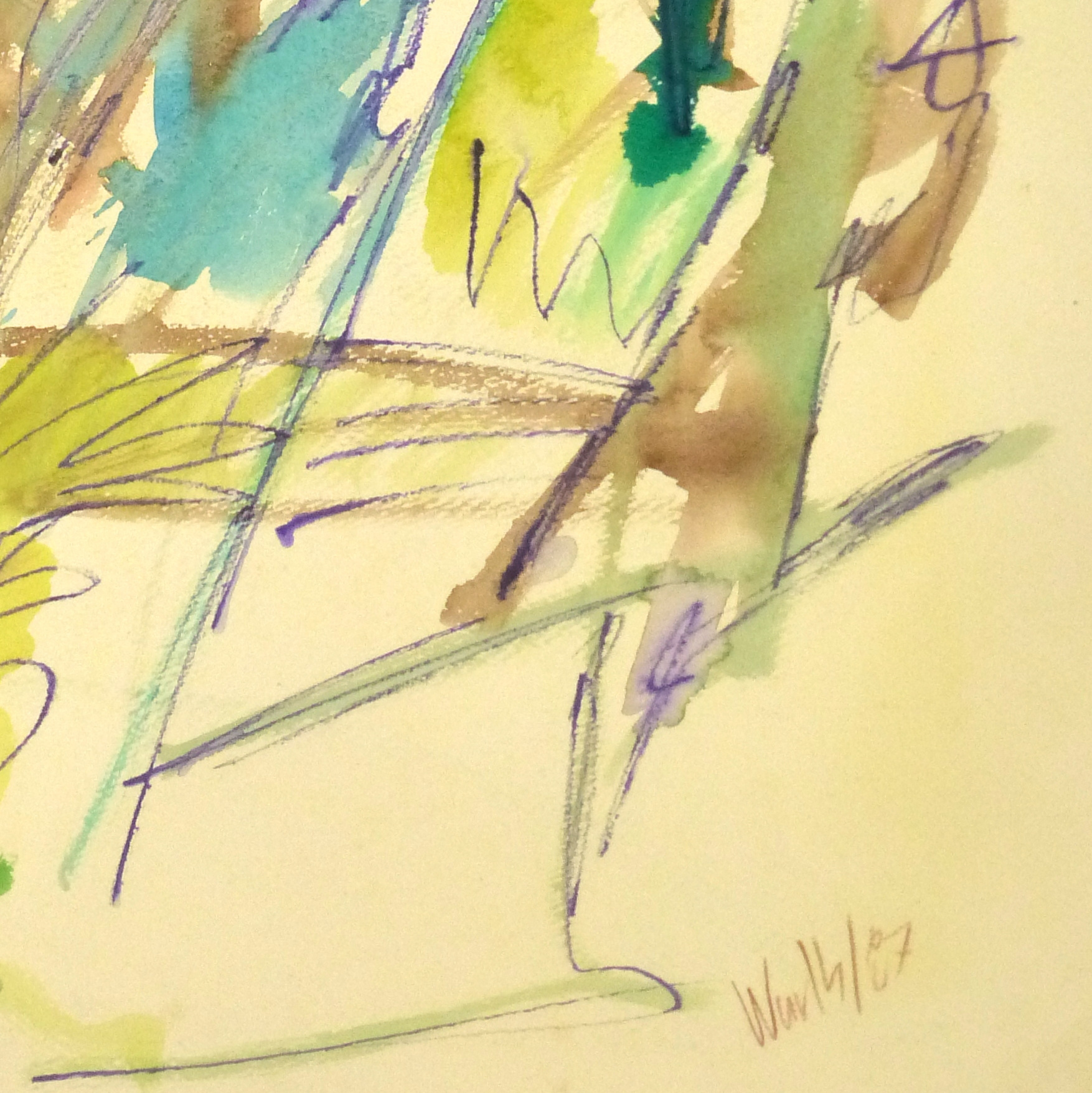 Watercolor abstract of flowing shapes in ocean colored hues and accented with purple, 1987. Signed “Wurth” and dated lower right.