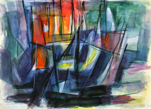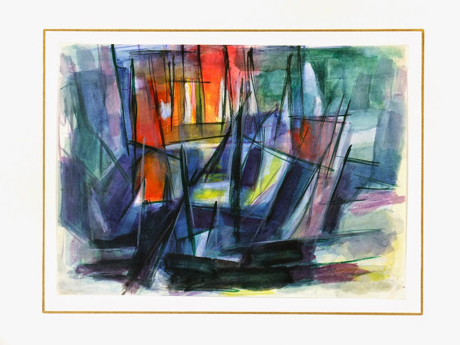 Vivid French gouache abstract of a small row boat using a rainbow of bright hues, circa 1960. Unsigned.