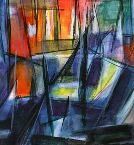 Original watercolor abstract painting utilizing sharp angles and bright colors to make a sunset landscape, circa 1960.