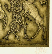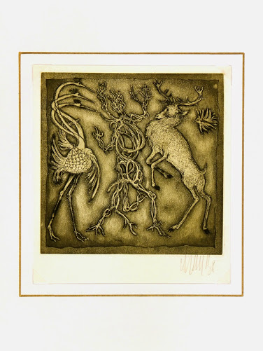 Detailed etching of a majestic stag and crane facing off with a figure made of roots. Signed lower right.