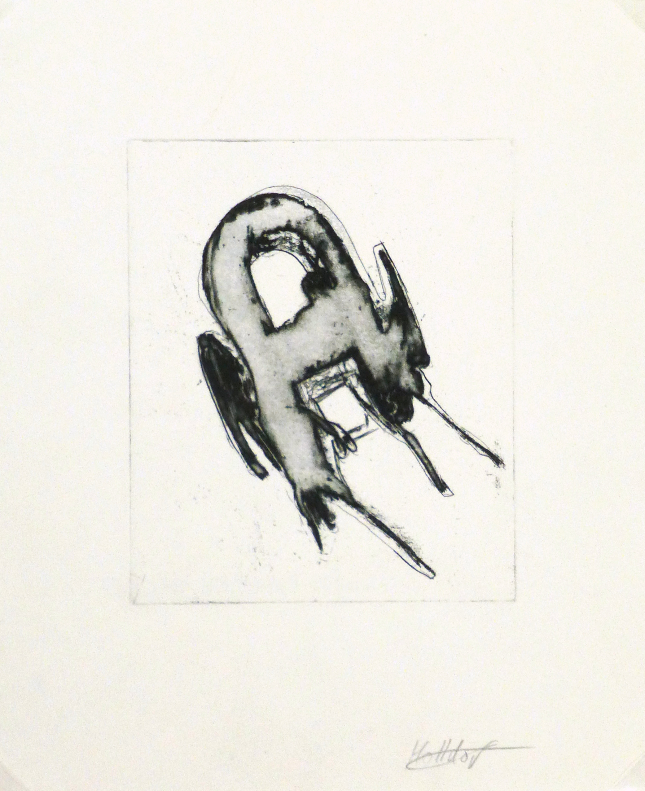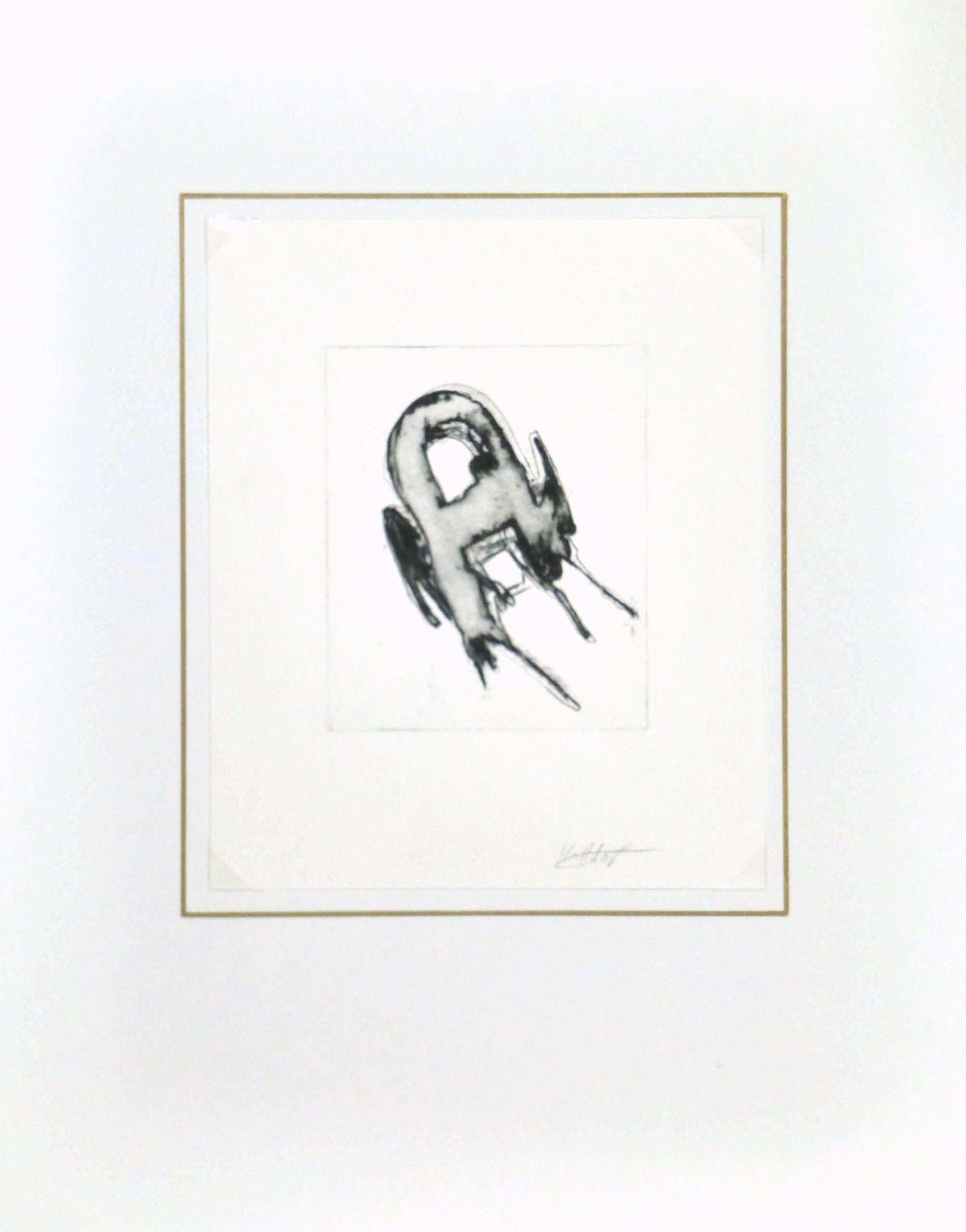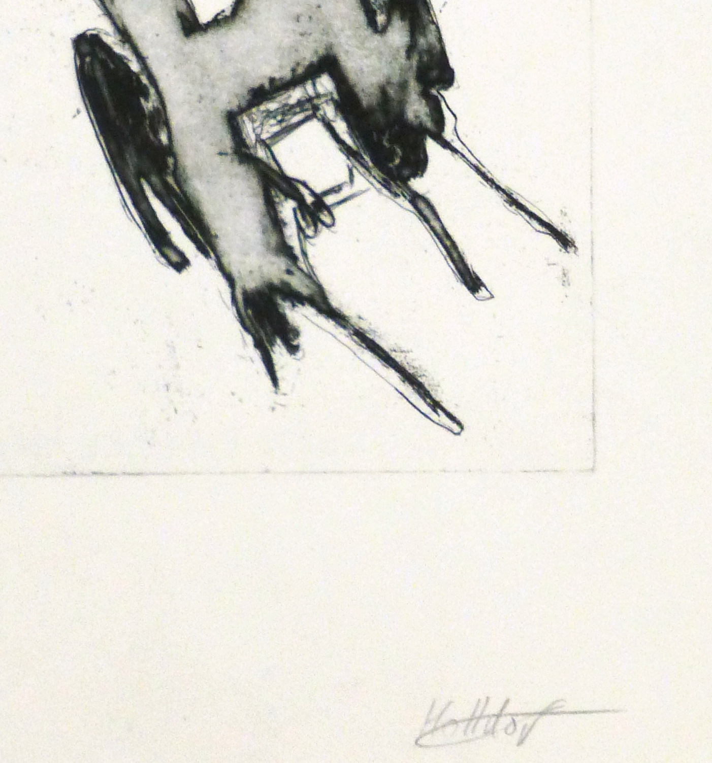 Black and white abstract engraving by artist Lisa Holldorf, circa 1990. Signed lower right.