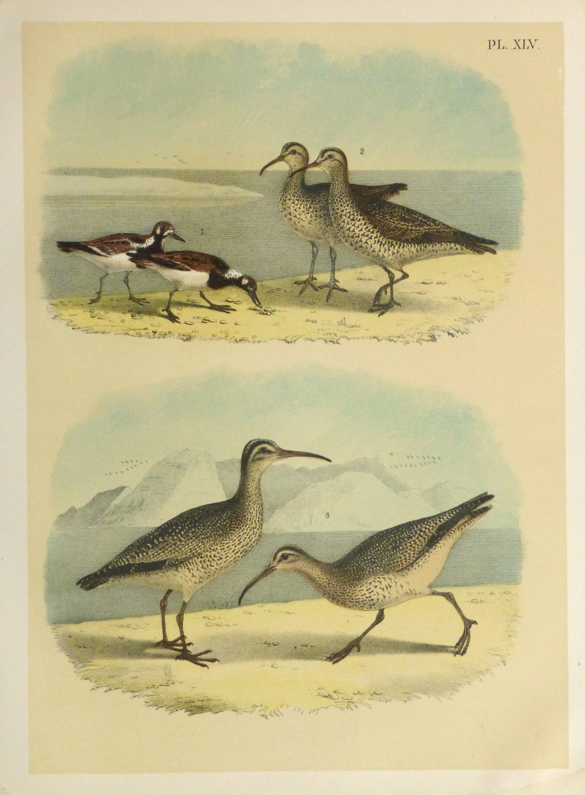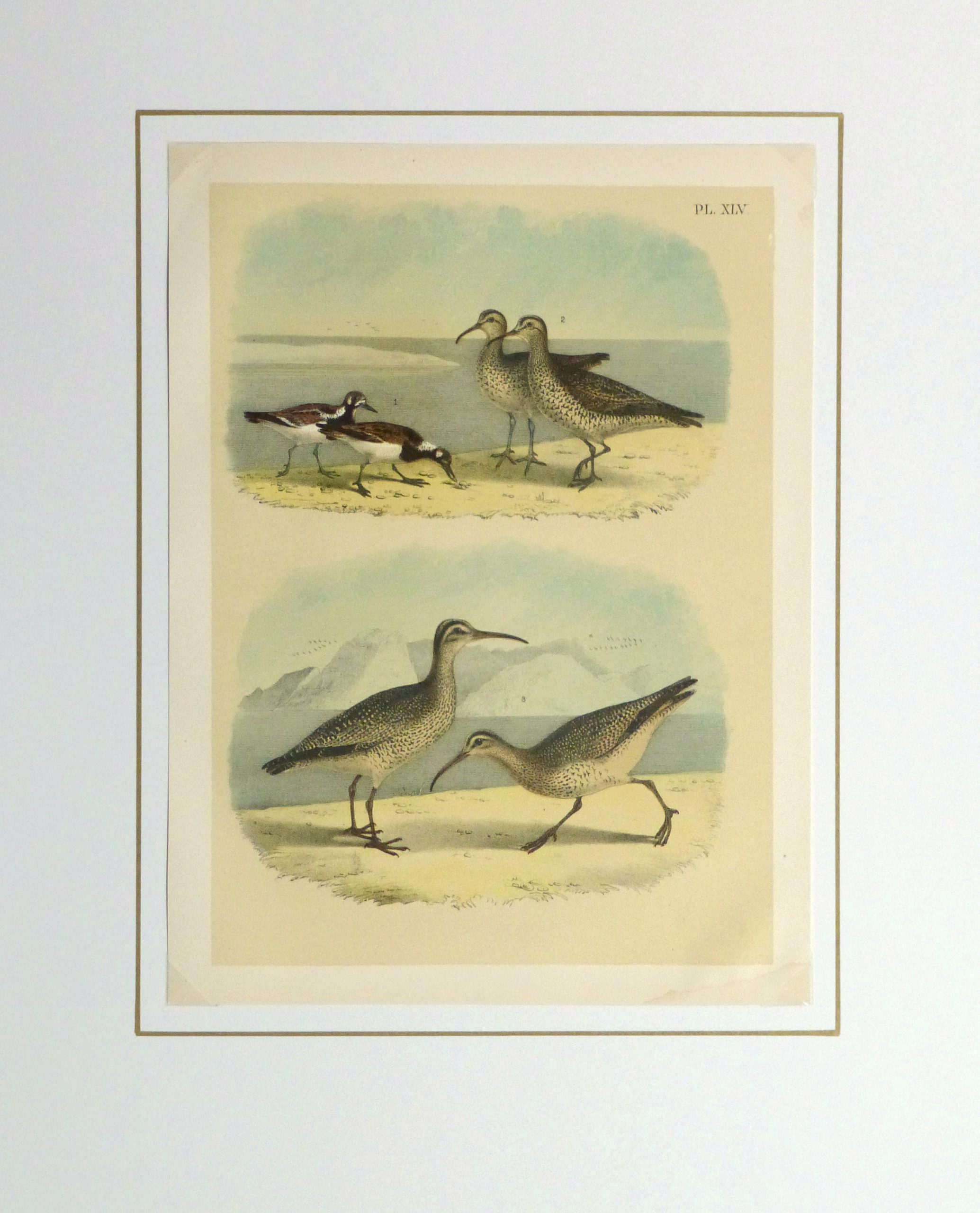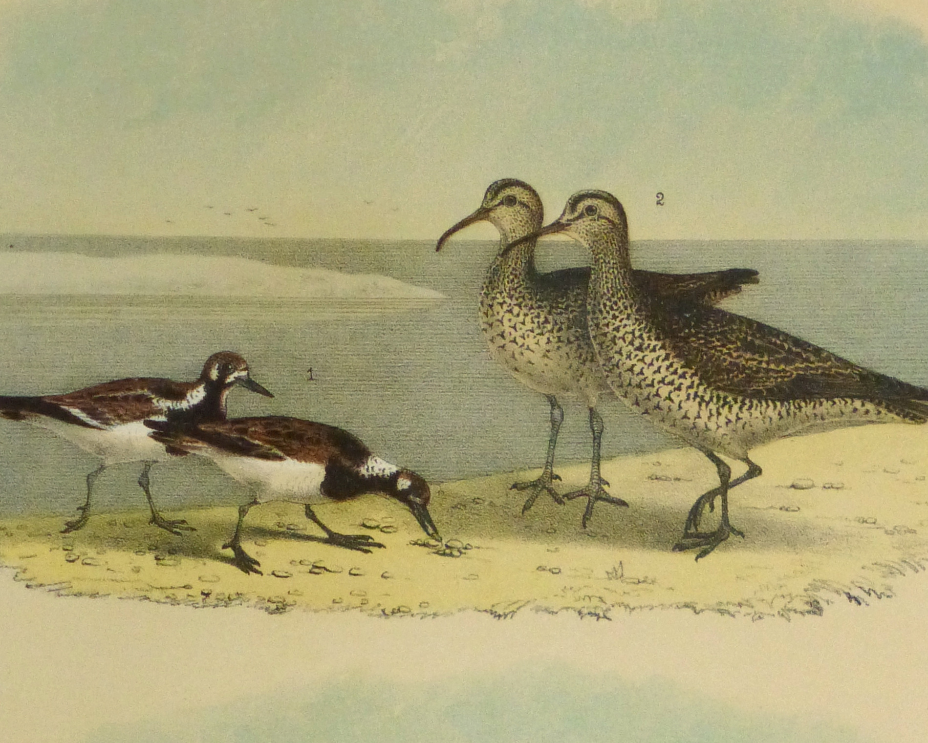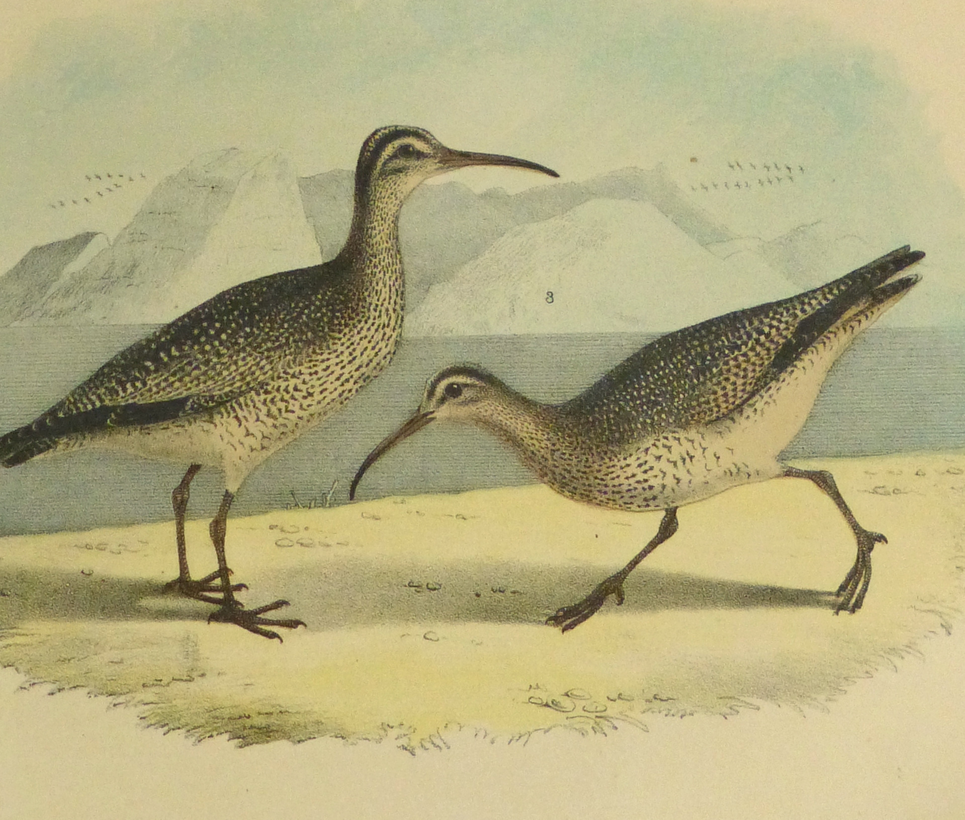 Charming color stone lithograph of various North American curlews in their natural beach habitat by Studer, 1881.