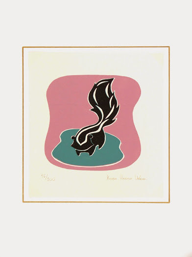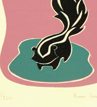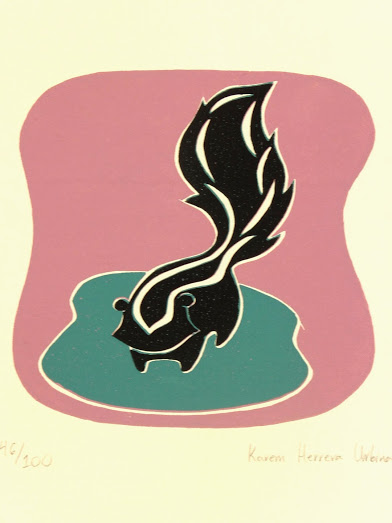 Contemporary serigraph of a stylized skunk set within graphic, colorful shapes by artist Karem Herrera Urbina, 2012. Signed lower right, numbered 46 of 100 lower left.