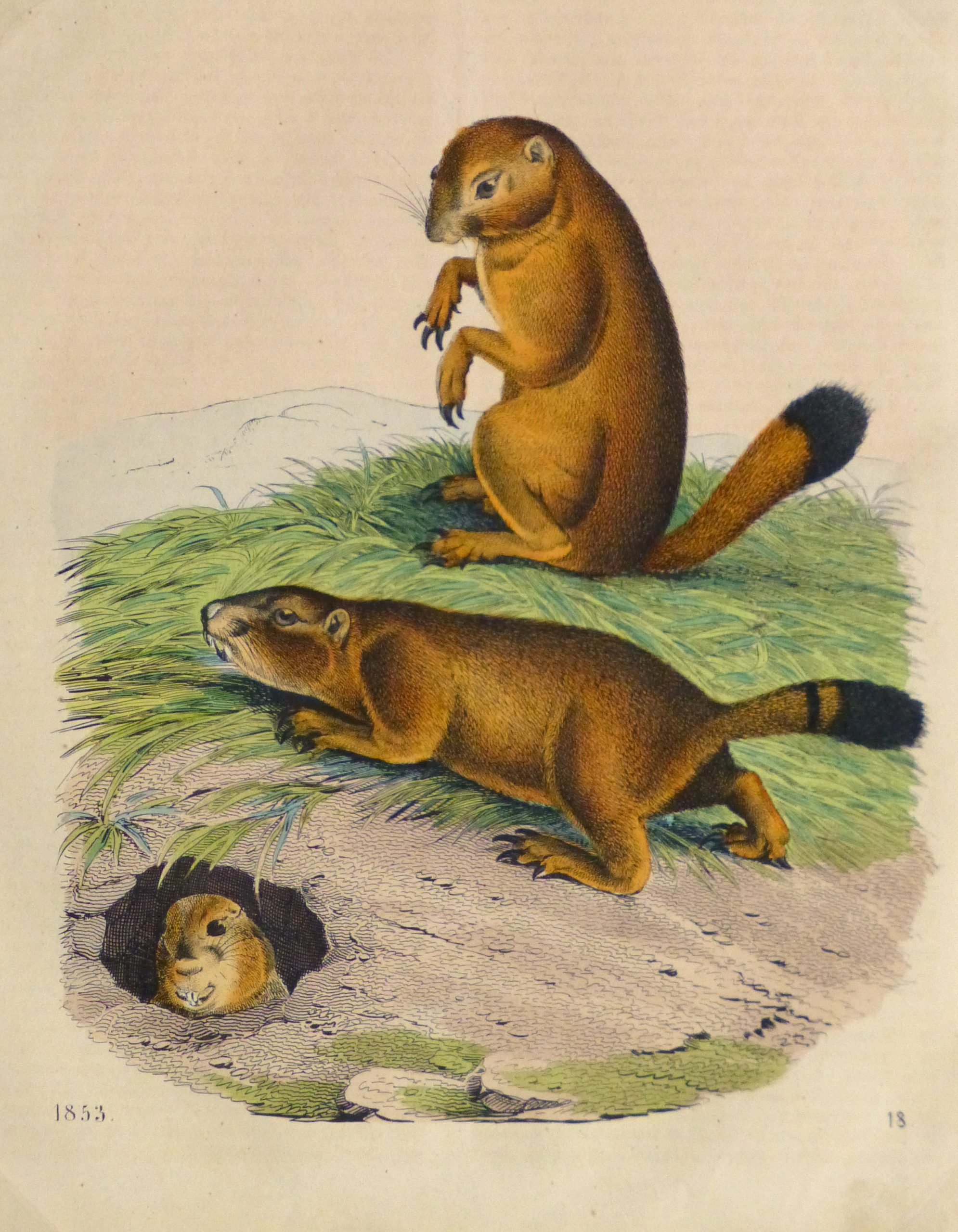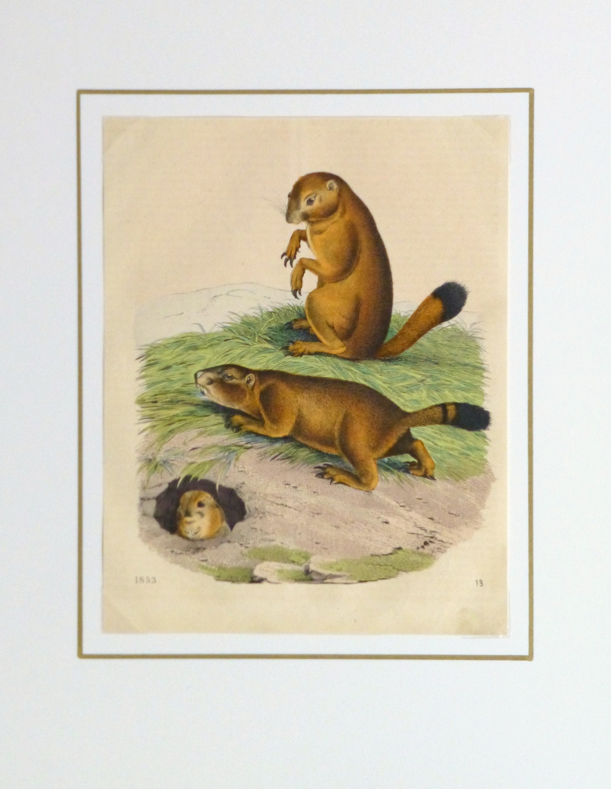 Vibrant antique hand colored engraving of three prairie dogs in their natural habitat, 1853. Dated lower left.