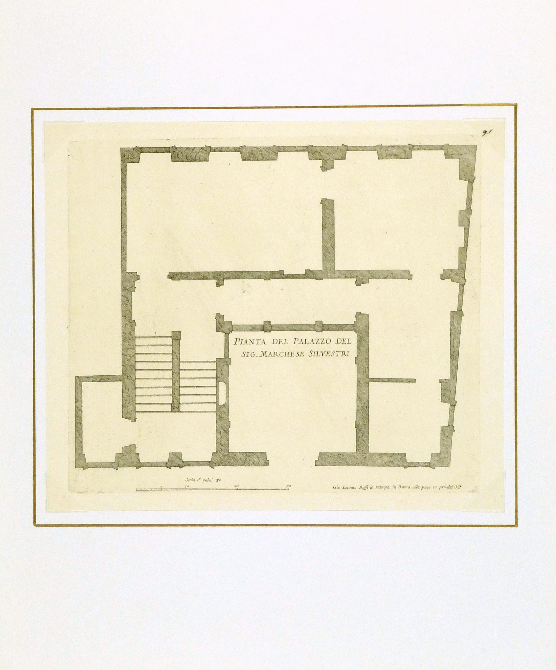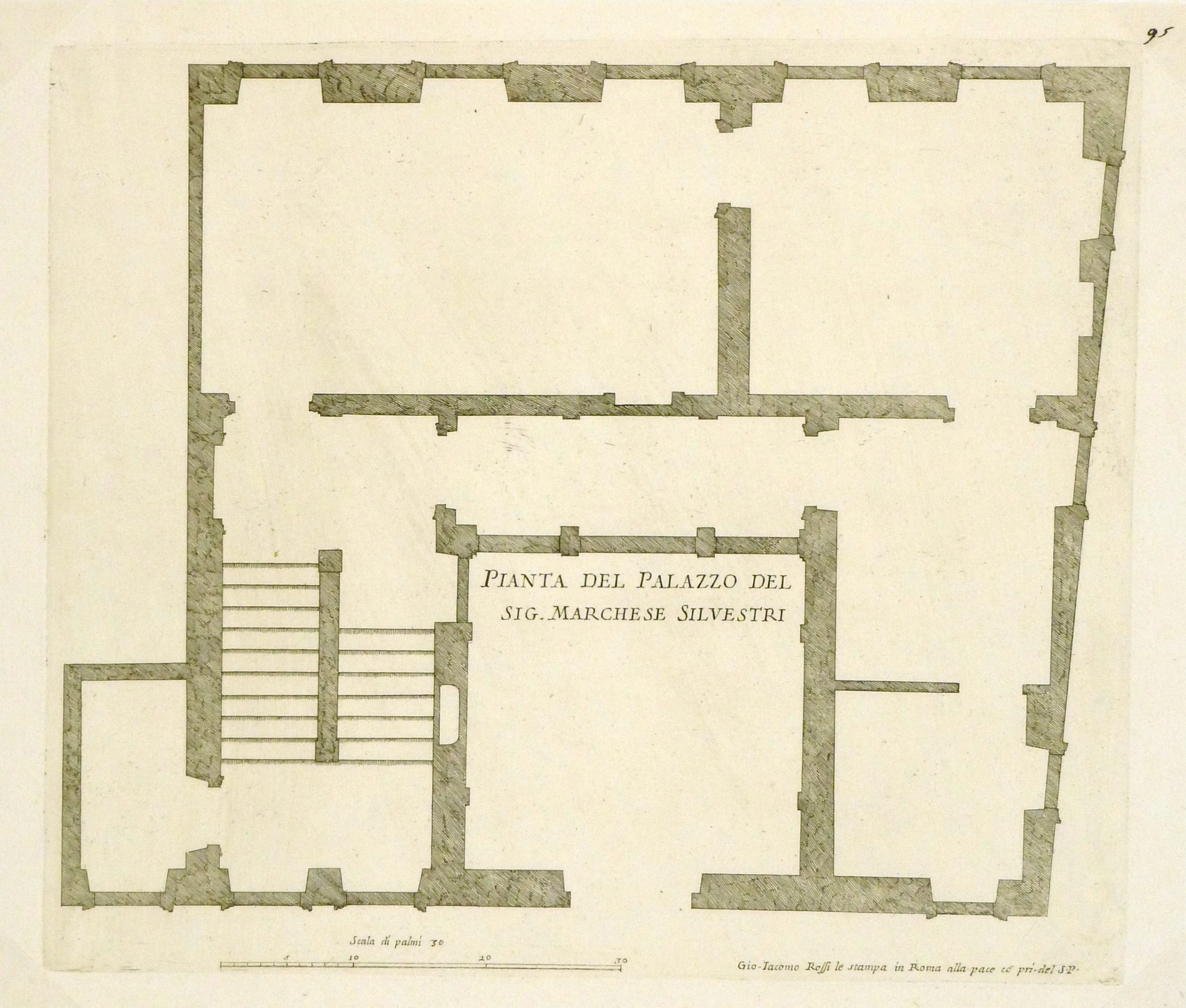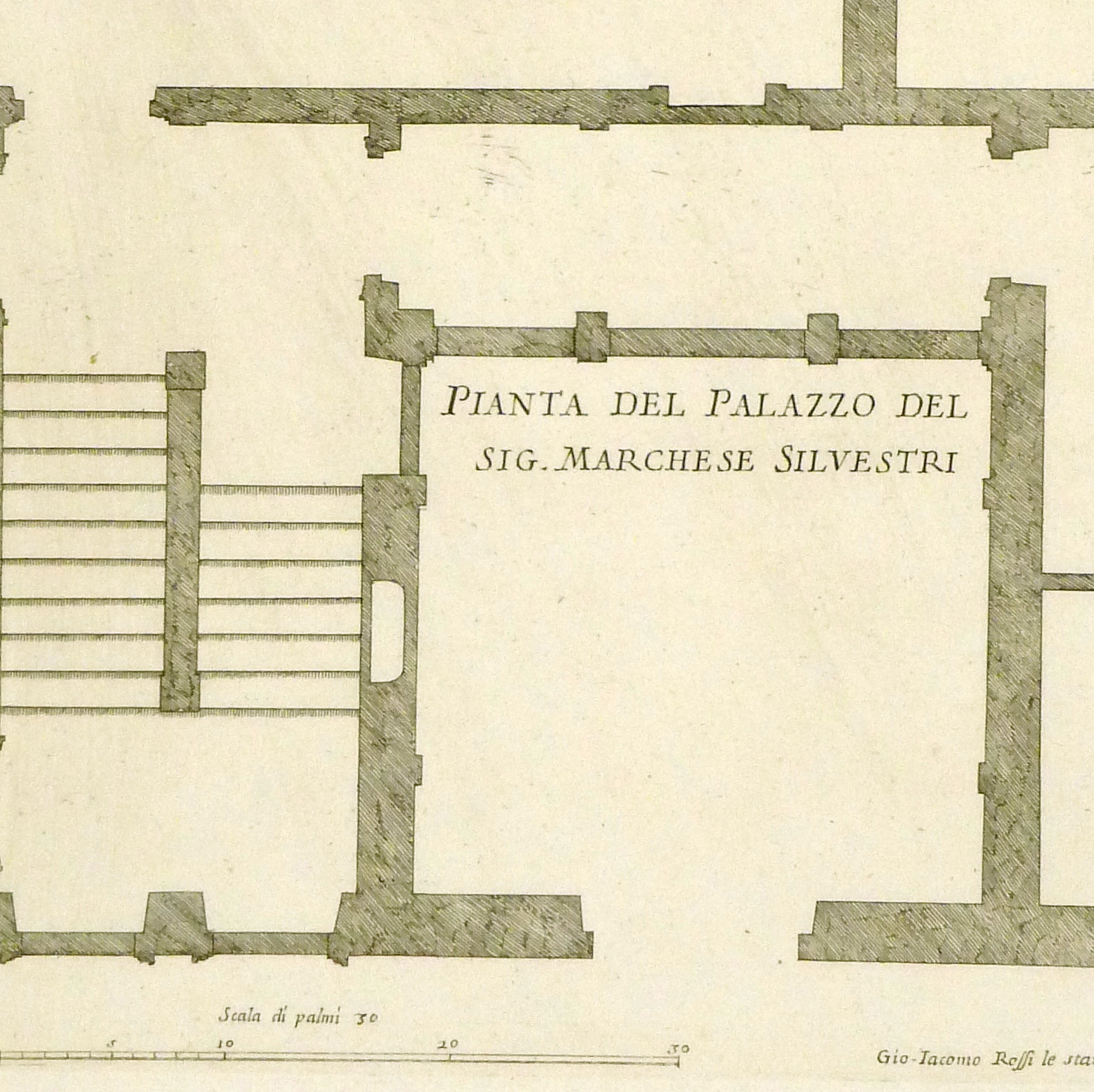 Antique copper engraving of the floor plans to the Palace of Marquis Silvestri located in Rome by Giacomo Rossi, 1650.