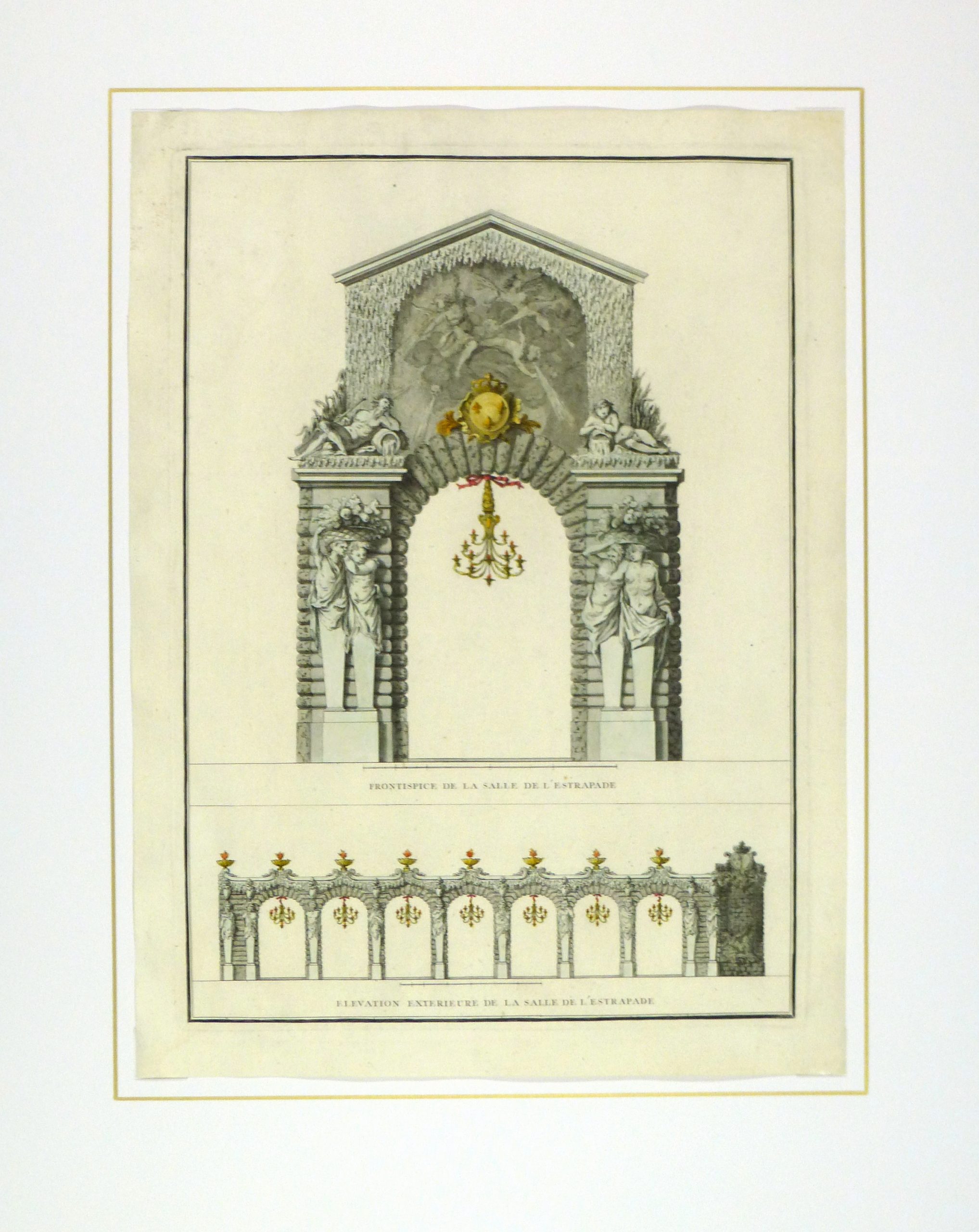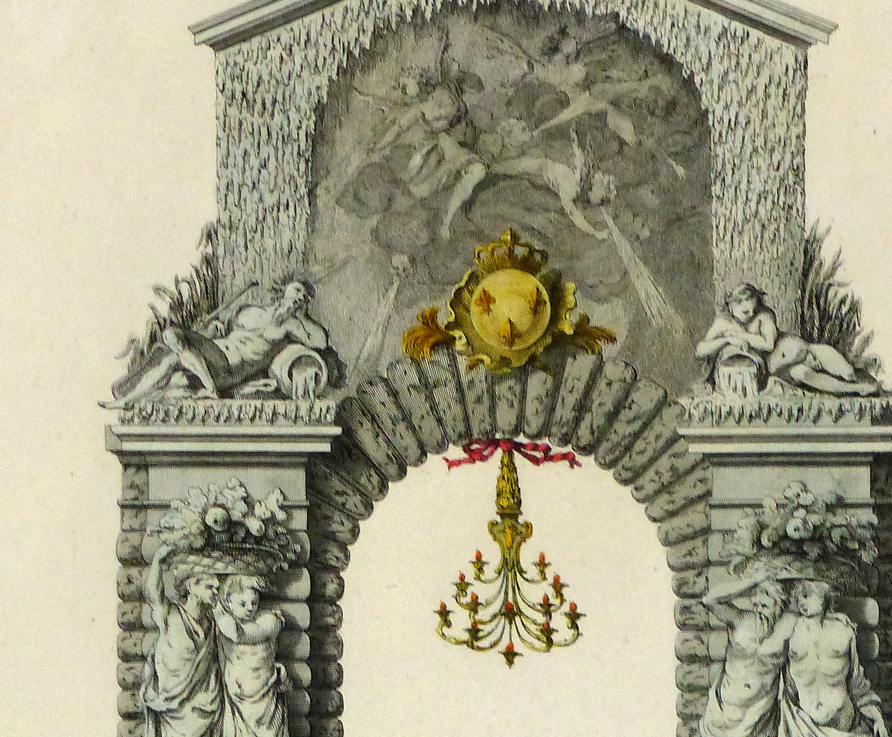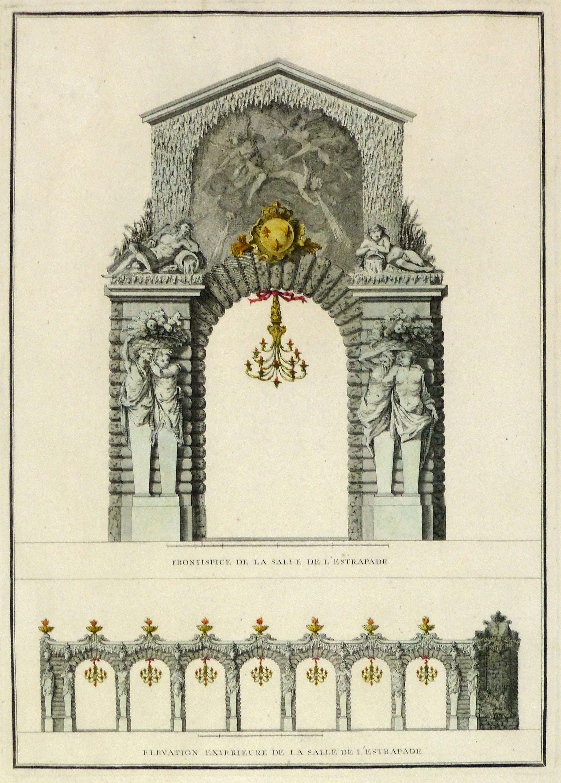 Antique copper engraving of architectural decor made by the city of Paris for the wedding of the crown prince by Charles-Nicolas Cochin le Père, 1745. Hand colored.