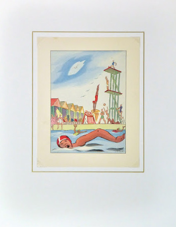 Lively Art Deco color lithograph of swimmer and fellow pool goers enjoying a clear day at the pool by artist Luc Vincent, 1932. Signed in plate lower right.